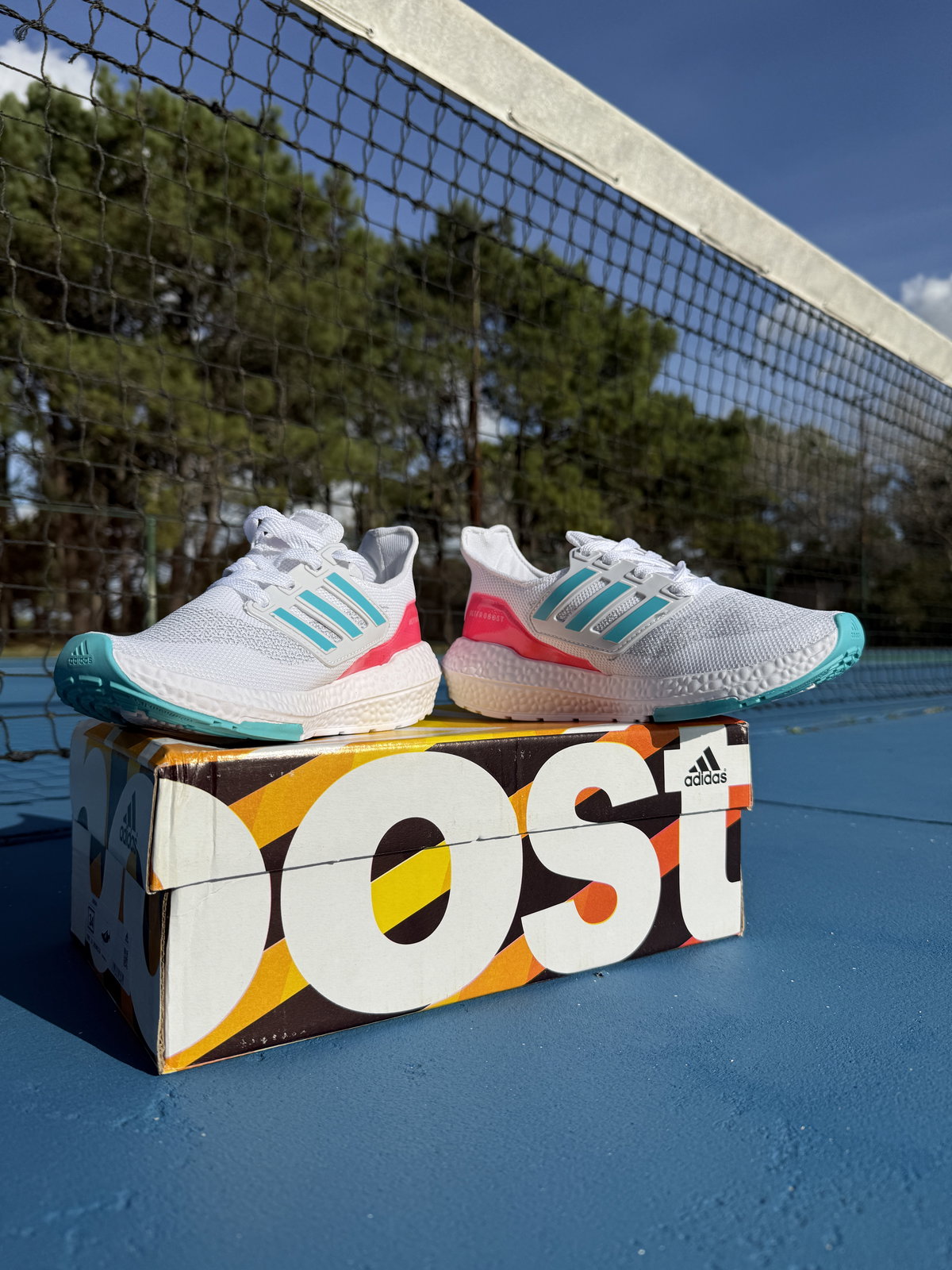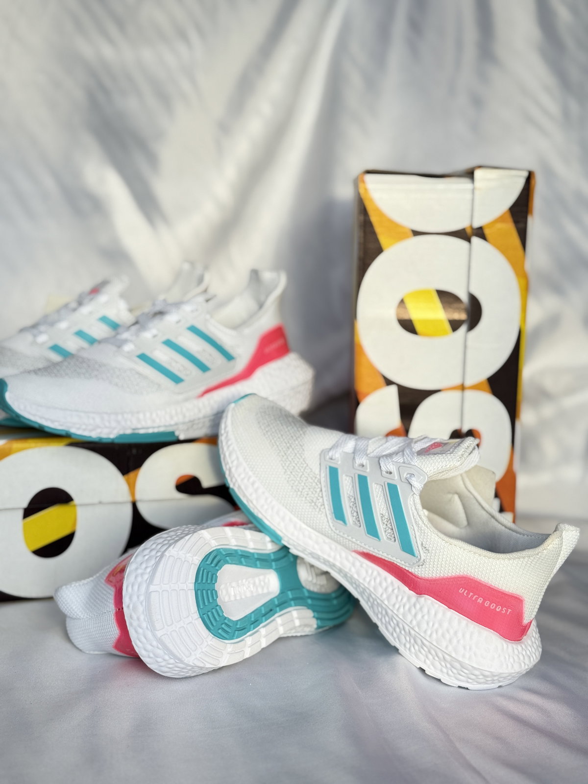Diseñadas para moverte con energía, las Adidas Ultraboost combinan rendimiento y estilo. Con una capellada de tejido técnico que se adapta al pie y una entresuela Boost que ofrece máxima amortiguación y retorno de energía, son ideales para entrenamientos o uso diario. Su diseño vibrante en blanco, turquesa y rosa les da un look moderno y llamativo que no pasa desapercibido.