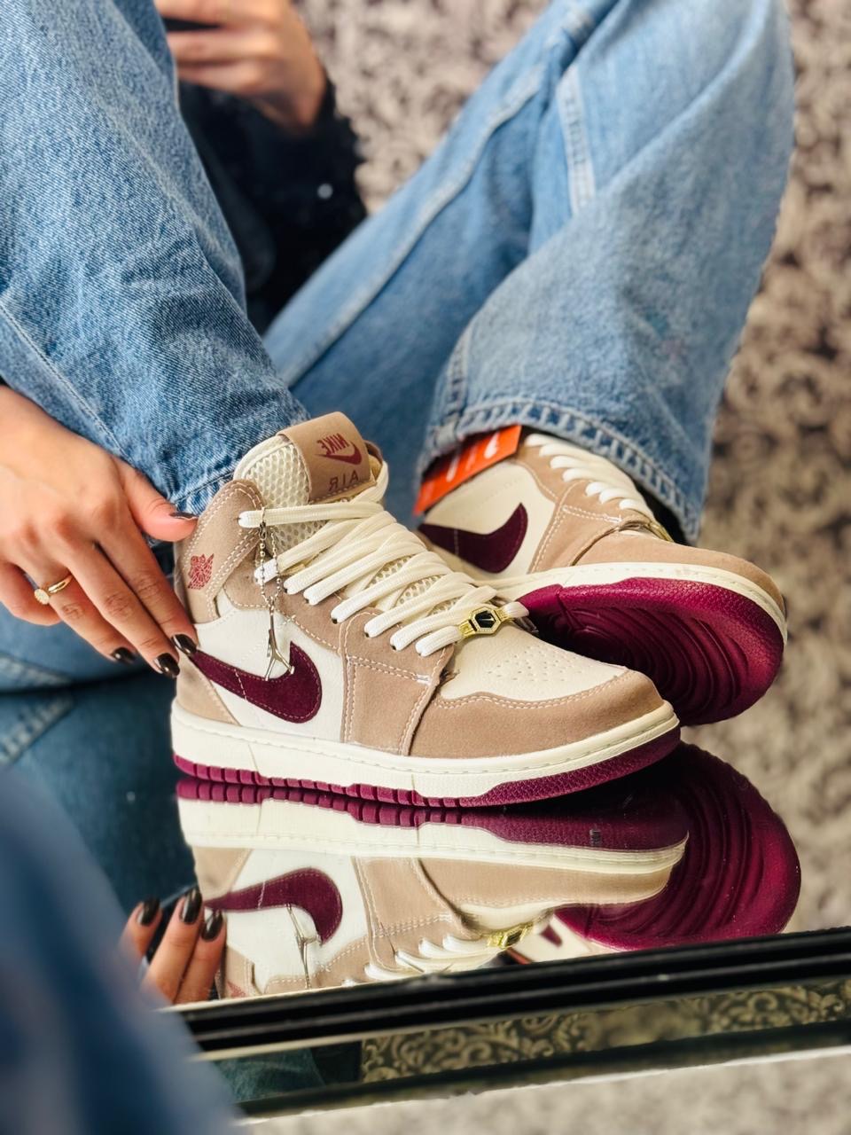 Dale un giro a tu estilo con las Jordan Mid en tonos Beige & Bordo, un modelo pensado para mujeres que pisan fuerte con elegancia.