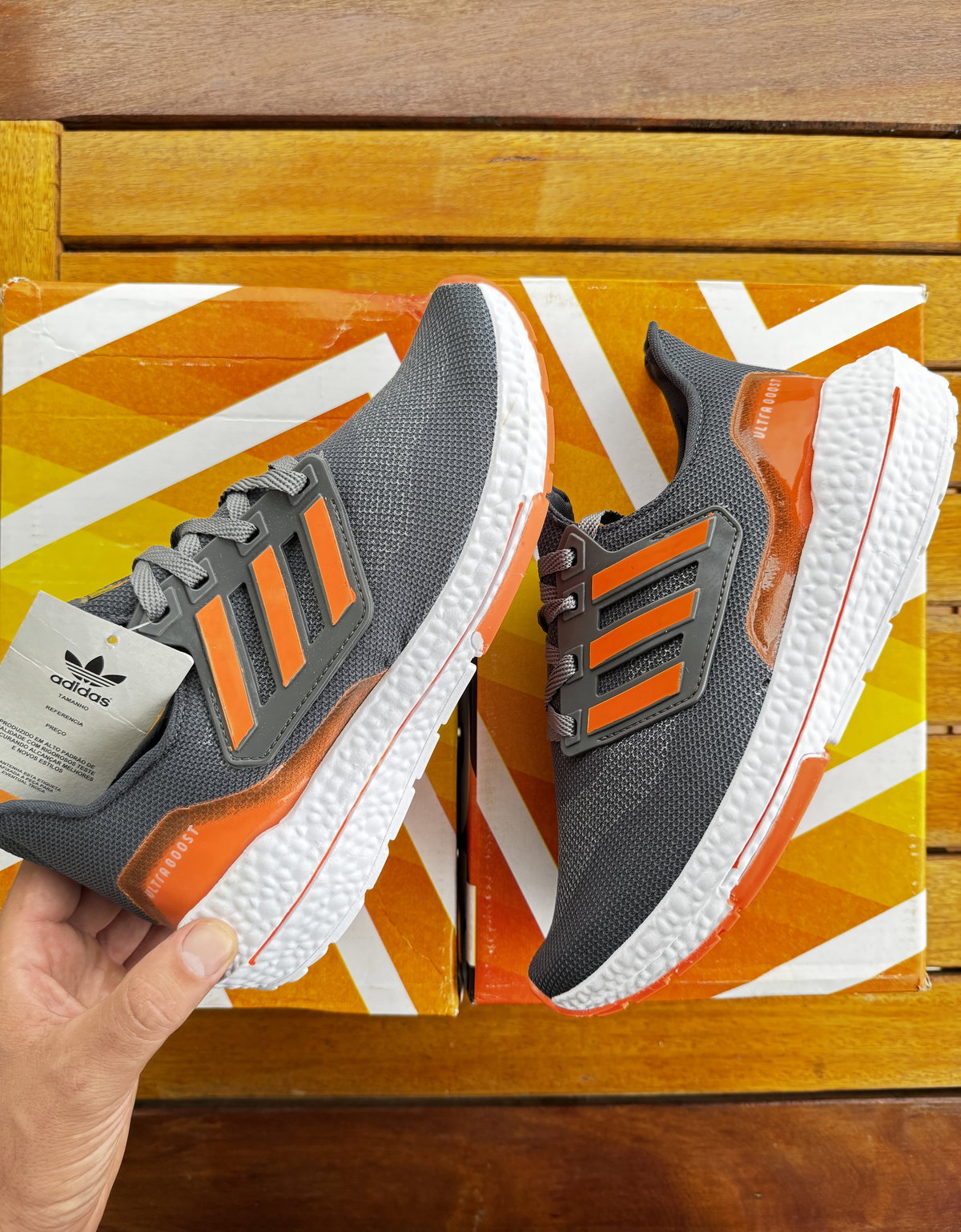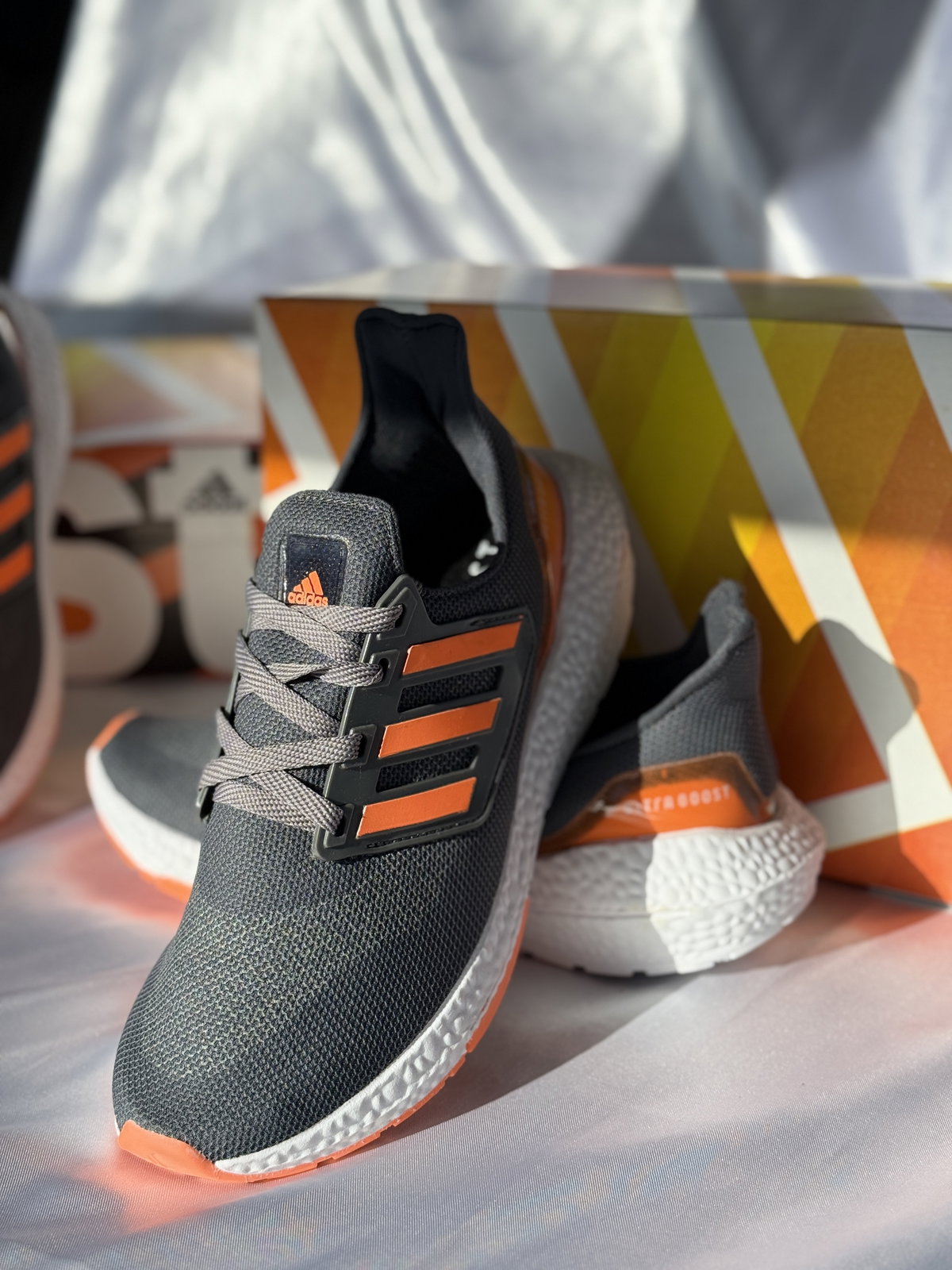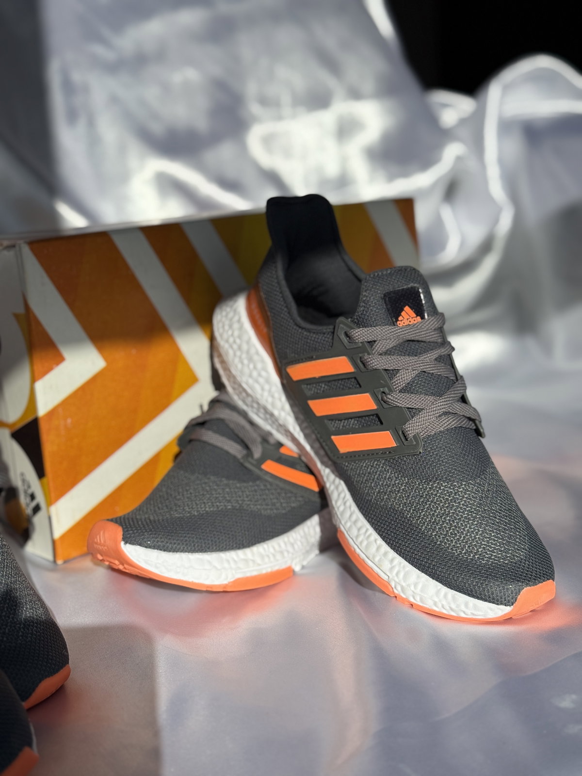 Confeccionadas en una malla gris respirable, con detalles en naranja vibrante que destacan el icónico diseño de las tres tiras. Su suela Boost ofrece una amortiguación superior y retorno de energía, perfecta para quienes buscan rendimiento y confort. Ideales tanto para correr como para uso urbano, con un diseño que no pasa desapercibido.